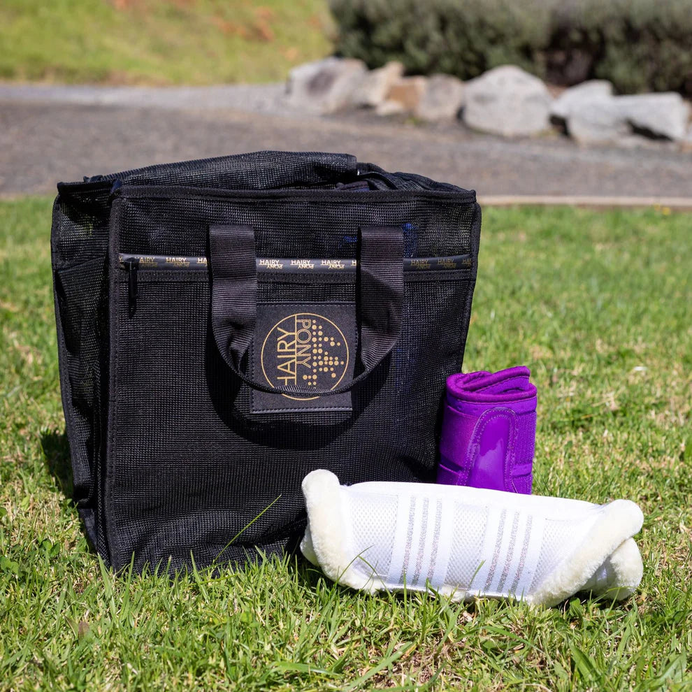 Made with quick drying, waterproof mesh, the HAIRY PONY MESH BOOT BAG is designed to store all your sandy, dirty & wet horse boots. The durable mesh material allows sand & dirt to fall through the bottom of the bag, allowing you to shake or hose off boots neatly in the bag, before hanging out to dry. The HAIRY PONY MESH BOOT BAG has plenty of room with six internal divided spaces for your horse’s boots, as well as a gold snap ring to hold accessories.